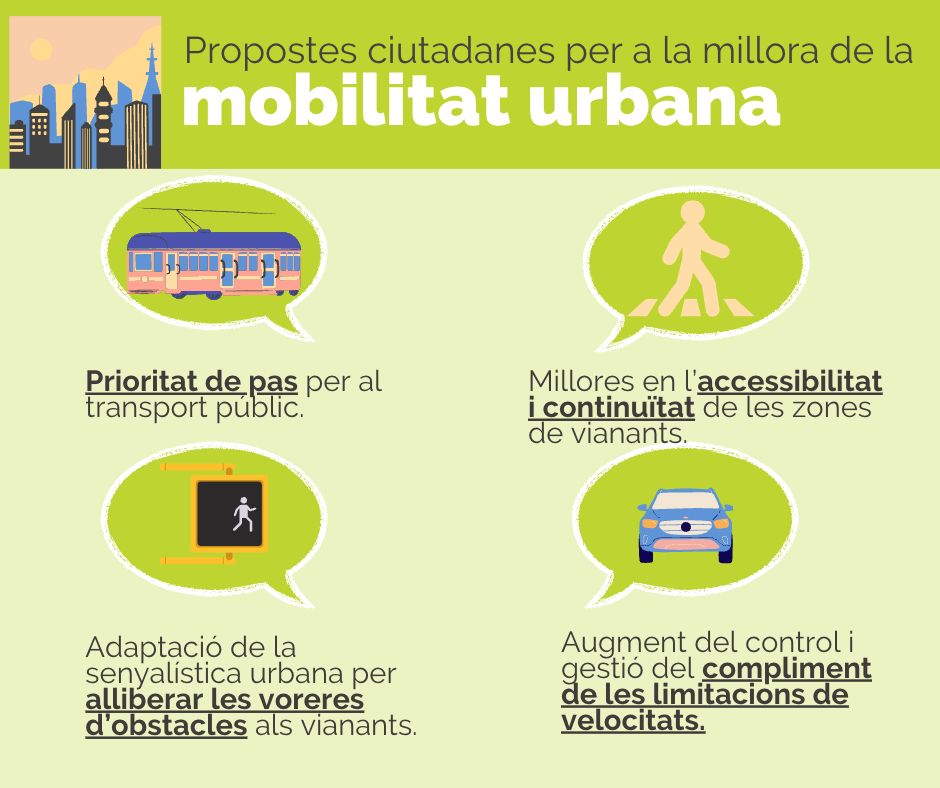 Per tal de millorar la mobilitat urbana, les propostes s’adrecen a la necessitat de donar prioritat a vianants a l’hora de dissenyar les poblacions, eliminant obstacles i millorant l’accessibilitat, i plantejant mesures dissuasives perquè els cotxes no accedisquen als nuclis urbans, fet que passa per l’habilitació d’aparcaments dissuasius i la millora del transport públic als municipis.