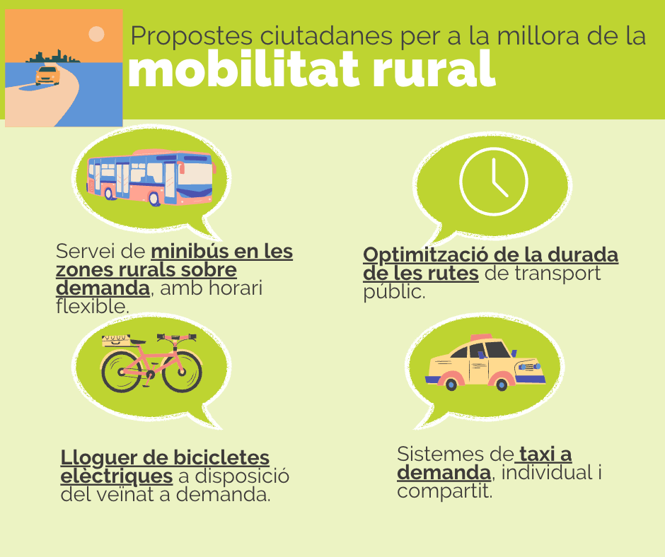Algunes de les propostes més destacades són les que tenen com a objectiu pal·liar els efectes del despoblament i connectar de manera adequada i sostenible els municipis de menor població amb les capçaleres de comarca i de província. Les persones participants aposten pel transport a demanda, tant en taxi com en autobús, així com per optimitzar la durada de les rutes, millorar la informació disponible i ampliar les opcions de pagament al transport públic.