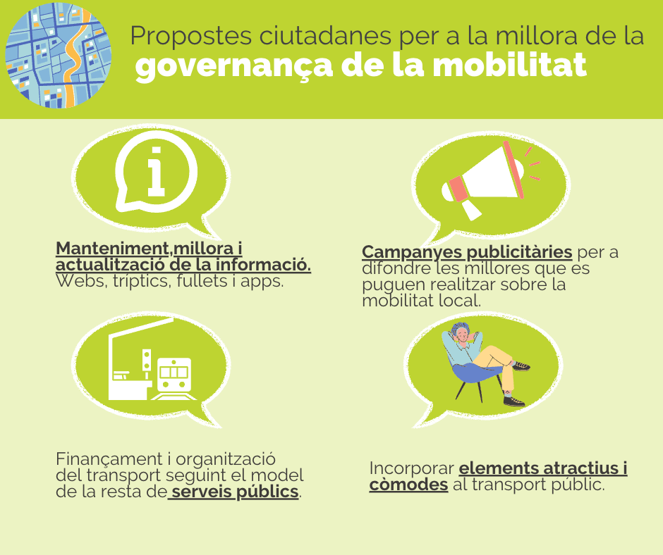 Pel que fa a la governança de la mobilitat, es plantegen solucions com la implementació de tarifes planes per al transport comarcal, la visió del transport com a servei públic, i la millora de la informació que s’ofereix i la comunicació sobre els serveis disponibles, tant a nivell digital –amb apps i webs centralitzades que disposen d’informació actualitzada–, com amb tríptics, cartelleria i campanyes publicitàries.