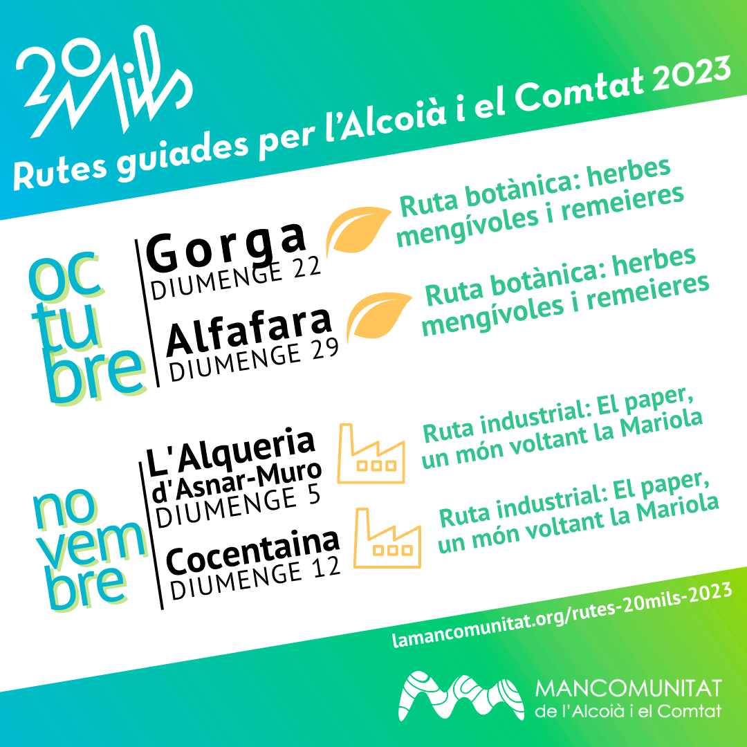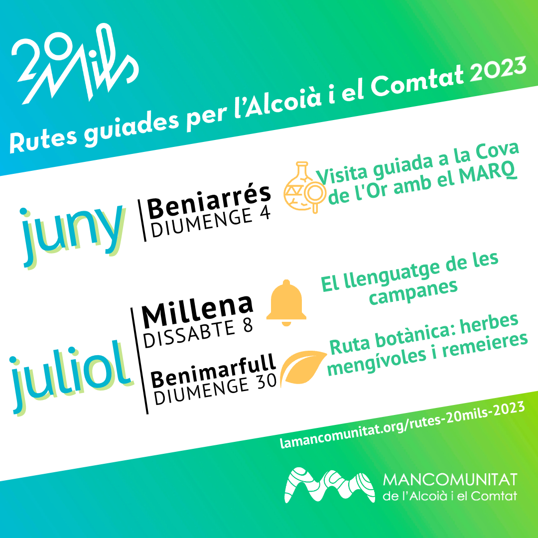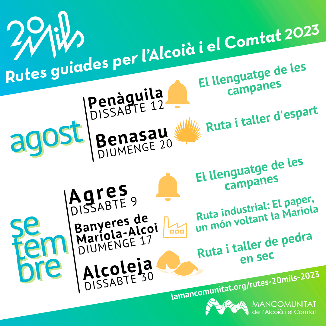 La Mancomunitat de l’Alcoià i el Comtat, des del departament de turisme, presenta la programació de les rutes guiades 20Mils per a 2023, després de l’extraordinària acollida de les edicions anteriors. La proposta d’enguany planteja rutes que, a més de gaudir dels privilegiats paisatges de les comarques, permetran a les persones assistents conéixer el ric patrimoni de la zona, entre els mesos de juny i novembre. Totes les cites de la programació són gratuïtes amb inscripció prèvia, ja que les places són limitades. Les rutes treballaran diferents temàtiques: arqueologia, botànica, indústria paperera, toc manual de campanes, espart i pedra en sec.