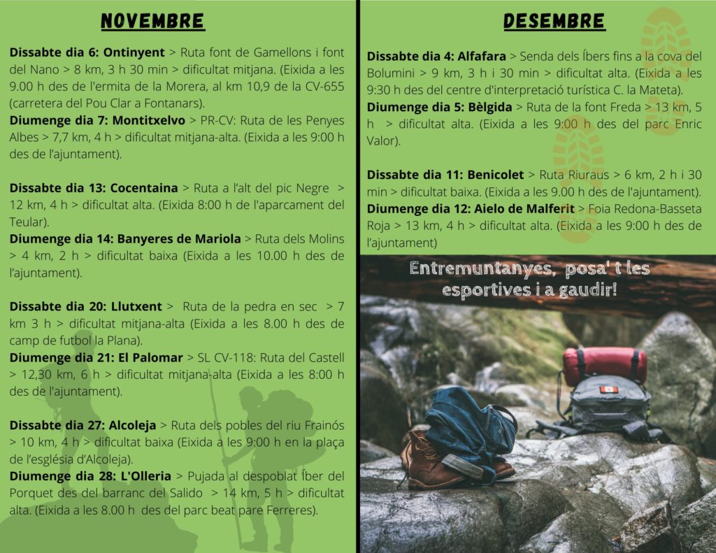 La Mancomunitat de l’Alcoià i el Comtat i la Mancomunitat de la Vall d’Albaida tornen a col·laborar en la planificació d’activitats per a dinamitzar les comarques amb una nova edició de Senderisme Entre Muntanyes. Es tracta d’una programació de rutes guiades gratuïtes que es duen a terme els caps de setmana de setembre a desembre.